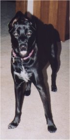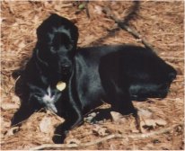In February of 2000 we got our first dog. She is a mutt that we picked up at the Cobb County Humane Society and her name is Enyo (Greek goddess of war). She was only 6 weeks old and 4.2 lbs when we got her but she's full grown now (about 55 lbs). She's solid black and has a white five-point star on her chest. She also doesn't have a tail. Enyo and all her siblings at the pound had already had their tails docked (why they did this, we'll never know). The funny thing about her is her ears. When she's tired, they droop down but when she's wide awake, they stick up so much that they touch at the tips so it looks like a "mono-ear"! She's a really well behaved dog and a VERY fast runner. Even though she's full grown now, she's still quite playful and even goes into a "turbo-puppy" mode from time to time where she will run (very fast) up and down the hall, arround the couch, back down the hall, etc. She can be a real spaz at times but she's a lot of fun!