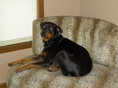 We spent about 2 years looking for a rotweiler before we found a good, reputable breeder (not a puppy mill). We got Zeus on May 6, 2001 when he was 8 weeks old and about 14 lbs. He's a very high quality dog and has 20+ championships listed on his pedigree (although we're not interested in taking him to dog shows, we just wanted him as a pet). He's full grown now (about 125 lbs.)and he and Enyo have LOTS of fun playing together. Enyo is still the dominant one (she was there first, after all) but he does manage to give her a hard time some times. Mostly they just act exactly as you'd expect siblings to. They play hard (tug-o-war is their favorite) when they're energetic and they sleep together when they're tired.